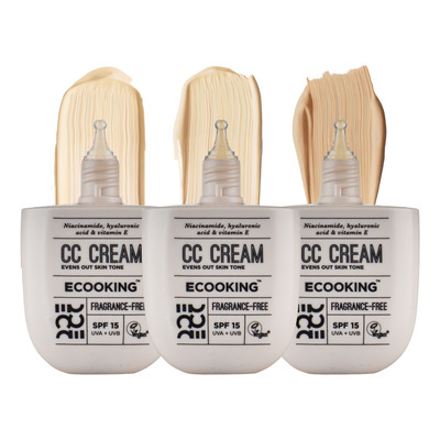 ECOOKING CC Cream kombinerer hudpleje og makeup i én farvet creme, der korrigerer rødme, udjævner hudtonen og giver et naturligt resultat. Cremen indeholder hyaluronsyre og E-vitamin, som fugter og beskytter huden, samt niacinamid, der forbedrer hudens struktur og mindsker ujævnheder. Den lette konsistens gør den nem at fordele og velegnet til daglig brug.