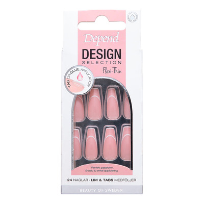 Depend Cosmetic Design Selection Artsy Smiles Coffin er kunstige negle med moderne fransk inspireret design. Neglene har en coffin form, som giver et elegant og velplejet udtryk. Det grafiske smile design skaber et stilrent look, der passer til både hverdag og fest. Flexi-Thin teknologien sikrer en tynd og fleksibel pasform, som følger din naturlige negl.