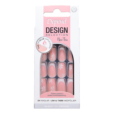 Depend Cosmetic Design Selection French Flower Blossom Short Coffin er kunstige negle med kort coffin form og fransk inspireret design. Neglene har en lys base med hvide blomsterdetaljer, som giver et velplejet og feminint udtryk. Flexi-Thin teknologien sikrer en tynd og fleksibel pasform, der følger den naturlige negl. Sættet indeholder 24 negle i forskellige størrelser, så du nemt kan finde den rette pasform.