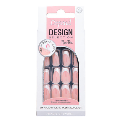 Depend Cosmetic Design Selection French White Chrome Short Coffin påsættes hurtigt med medfølgende lim eller tabs (dobbeltklæbende negletape). Tabs gør det muligt at genbruge neglene ved korrekt aftagning. I pakken finder du også fil og manicurepind til forberedelse. En udførlig brugsanvisning medfølger og guider dig trin for trin.