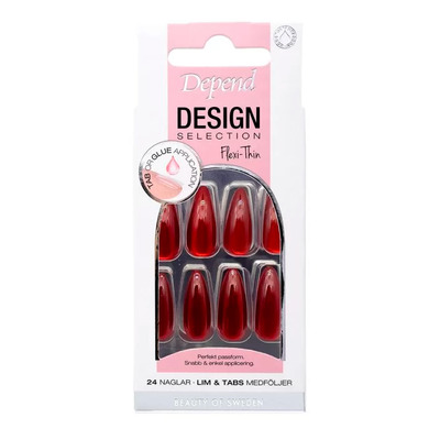 Depend Design Selection Ruby Red Almond føles naturlige og giver et ensartet resultat. Hver negl er nummereret, så du hurtigt kan finde den rette størrelse. Med i pakken får du også en fil, lim, tabs og manicurepind, så du har alt, du skal bruge for en hurtig og holdbar påsætning.