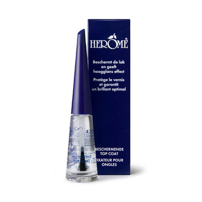 Med denne Herome Protecting Top Coat undgår du at negle eller neglelak bliver beskadigede, da overlakken lægger et hårdt beskyttende lag på neglene. Den transparente Top Coat er både beskyttende og vandafstødende, samtidig med at den frisker farven i neglelakken op. Overlakken giver en flot glans, så dine negle ser smukke og velplejede ud.