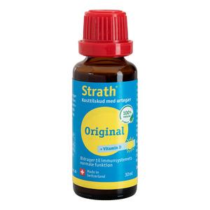 Strath Original eliksir med D-vitamin er ligesom de andre Strath-produkter fremstillet af gær (Saccharomyces cerevisiae), som fodres med en lang række urter. Gærcellerne optager under denne proces stoffer fra disse urter. Slutteligt nedbrydes cellevæggen i gærcellerne ved hjælp af plasmolysering og dette frigiver stofferne. Herefter udsættes gærprocessen for UV-lys, hvorved der dannes D-vitamin helt naturligt i produktet. Læs mere her.