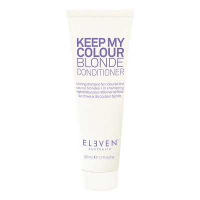 Eleven Australia Keep My Colour Blonde Conditioner er en farvebevarende balsam, der forstærker kolde nuancer i både naturligt og lysnet blondt hår. Den indeholder den blåbaserede EXT. 2 Violet-teknologi, som effektivt modvirker gyldne nuancer og toner håret til en klarere blond farve. Samtidig styrker den håret og efterlader det glansfuldt og velplejet med en frisk duft af vandmelon.