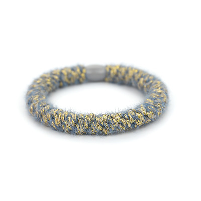 Denne fine hårelastik er lavet i det meget populære snoet design, der er lavet med en kraftig elastik, som er betrukket med et farvet bånd. Elastikken er med til at pifte dit outfit op, samtidig med den holder dit hår på plads. Den kan bruges i både tykt og tyndt hår, og snoet omkring håret så mange gange du ønsker, til den har det ønskede hold på håret. Denne elastik er lavet i et smukt design med blå og guld farver.