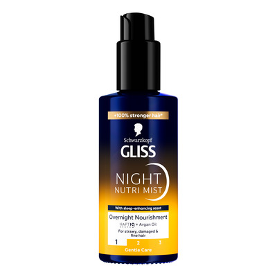 Schwarzkopf Gliss Night Elixir Oil Mist er en let hårmist, der plejer håret intensivt natten over uden at tynge det. Den er særligt udviklet til kruset, beskadiget og fint hår og trænger dybt ind med HaptIQ-system og arganolie, som styrker og reparerer håret. Resultatet er silkeblødt, glansfuldt og mere modstandsdygtigt hår ved opvågning.