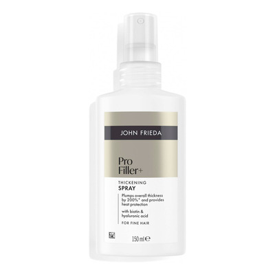 John Frieda ProFiller+ Thickening Spray er designet til at give fint og tyndt hår et øjeblikkeligt løft. Denne styling spray øger hårtykkelsen med op til 200 %, så håret både ser og føles tykkere og stærkere efter én vask. Beriget med biotin, som styrker håret, og hyaluronsyre, der tilfører intens fugt, sikrer den optimal pleje. Sprayen giver desuden varmebeskyttelse, så håret er beskyttet mod skader ved styling.