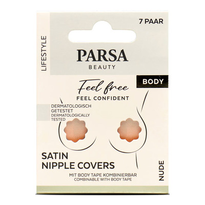 Parsa Beauty Nipple Covers Satin er selvklæbende og diskrete dækplastre til brug under tøj, hvor bh ikke er ønsket. De er dermatologisk testet og udformet i blød satin med en nude farve, der gør dem næsten usynlige under tøjet. Det selvklæbende materiale sikrer, at de bliver siddende hele dagen og føles behagelige mod huden. Perfekte til åbne rygge, dybe udskæringer eller lette materialer.
