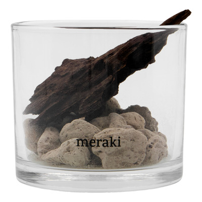 Meraki Duftfrisker Lavastone & Wood Sort er en dekorativ og funktionel duftspreder, der kombinerer porøse lavasten og drivtømmer i et stilrent glasdesign. Når du tilsætter et par dråber af din foretrukne æteriske olie, spreder stenene langsomt en behagelig og naturlig duft i rummet. Et æstetisk og duftgivende element til hjemmet.