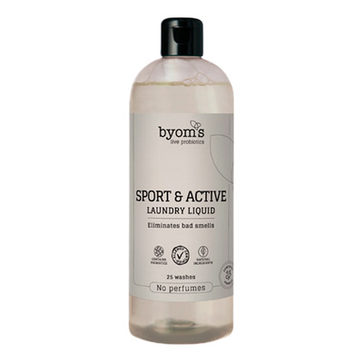 Byoms Laundry Liquid Sport & Active uden tilsat parfume er vaskemiddel med probiotika og lugtfjerner til sportstøj