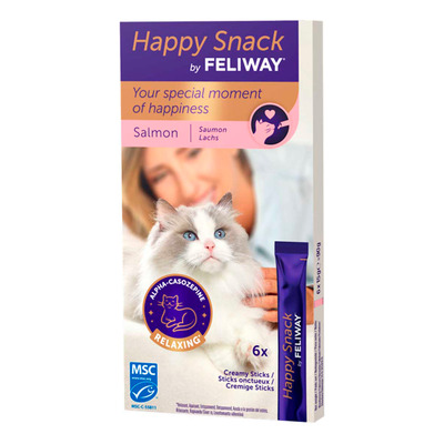 Feliway Happy Snack Salmon er en blød og velsmagende kattesnack, der kan gives direkte fra sticken, på en ske, i en skål eller som topping på foder. Snackens cremede konsistens gør den nem at anvende i dagligdagen. Den indeholder alpha-casozepine, et naturligt mælkeprotein, samt er uden farvestoffer, konserveringsmidler eller tilsat sukker.