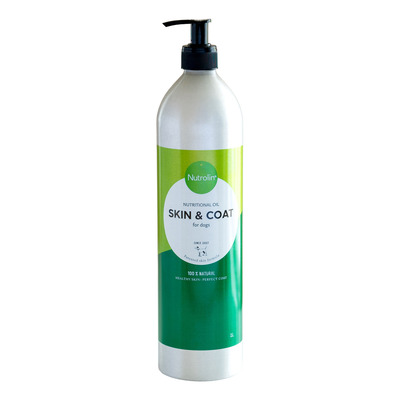 Nutrolin Skin & Coat 990 ml er et stort omega-6 tilskud med planteolier til hundens hud