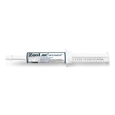 ZooLac Opti Paste kan gives sammen med foderet eller direkte på dyrets tunge. Den grå pasta med mørke partikler (aktivt vegetabilsk kul) accepteres let af de fleste dyr.
