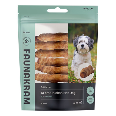 Faunakram 10 cm Chicken Hot Dog med leverfyld er en blød tyggegodbid til små hunde