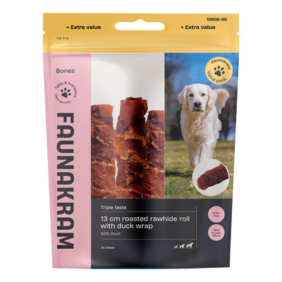 Faunakram 13 cm Roasted Rawhide Roll med andefyld er en ristet tyggerulle udviklet til mindre og mellemstore hunderacer. Rullen består af råhud med en blød fyldning af andefars, lavet på andekød og andelever, og er desuden svøbt i rent andekød. Produktet indeholder 50 % and og 40 % råhud, hvilket gør det til en nærende og smagfuld snack med lang tyggetid. Velegnet til både daglig forkælelse og aktivering.