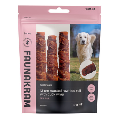 Faunakram 13 cm Roasted Rawhide Roll with Duck Wrap, Liver Filling fås i flere størrelser og varianter, så du kan finde den rette til din hunds behov. Produktet leveres i en praktisk pose med genluk, som holder indholdet frisk. Emballagen er mærket med flere sprog og overholder krav til kvalitet og sporbarhed. Produktet fremstilles på en IFS-certificeret fabrik i Kina.
