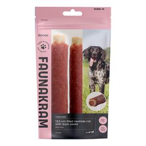 Faunakram 13,5 cm Filled Rawhide Roll med andefars er en smagfuld snack til alle hunderacer