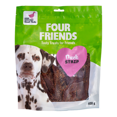 FourFriends Duck Strip er smagfulde strimler lavet med 88 % and, som gør dem til en populær belønning blandt hunde. Den bløde konsistens og gode tyggeoplevelse gør dem særligt velegnede til mellemstore og store hunde. Strimlerne kan gives hele eller nemt deles i mindre stykker.