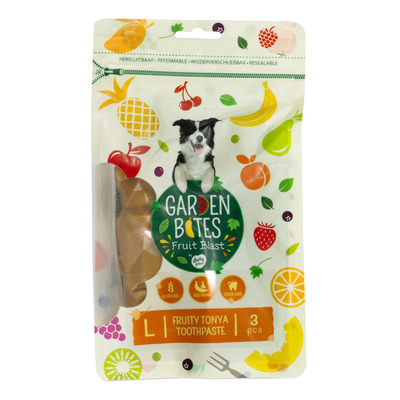 Garden Bites Fruity Toothpaste fra DuvoPlus bringer en ny dimension af sundhed og nydelse til din hunds snacktid. Disse vegetariske tyggestænger, med hele 55% sød kartoffel, er ikke kun lækre men også nærende, beriget med essentielle vitaminer, calcium og jern. "Fruit Blast" varianten kombinerer smagen af banan, fersken og pære, hvilket giver en frugtrig smag.