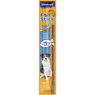 Vitakraft Fish Stick Laks er en solid snack med mere end 75% fisk, der har en uimodståelig duft af røget fisk. De naturlige omega-6 fedtsyrer understøtter en sund hud og smuk pels hos din hund. Vitakraft Fish Stick er udstyret med praktiske brudriller, som gør det nemt at dele pinden i mindre bidder.Denne snack er ideel til gåturen eller som en træningssnack, og den er helt uden tilsat sukker, farvestoffer og kunstige smagsforstærkere. Giv din hund en smagfuld og sund snack med Vitakraft Fish Stick Laks.