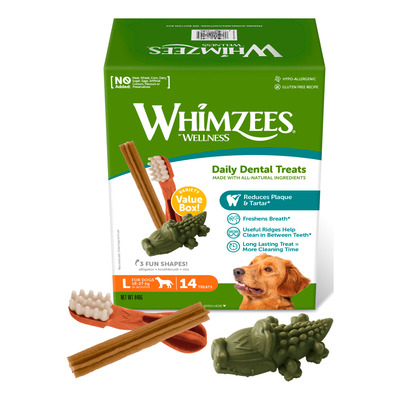 Har du svært ved at vælge mellem de forskellige varianter fra Whimzees, eller mangler du blot en gave til en hund eller hundeejer, som du har lyst til at forkæle? Den store, blandede boks fra Whimzees indeholder tre forskellige varianter, der alle er kendt for sin tandrensende effekt og fungerer som en "naturlig tandbørste" til din hund. Desuden har alle Whimzees produkter et lavt kalorieindhold og højt fiberindhold.