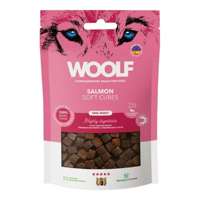 Woolf Soft Cubes - Salmon er en hundegodbid med en unik semi-fugtig tekstur, som udelukkende består af naturlige ingredienser. Disse all-naturlige godbidder fremstilles af minimalt forarbejdede ingredienser uden tilsat syntetiske tilsætningsstoffer såsom farver, smagsstoffer eller konserveringsmidler. Ingredienserne er velkendte og naturlige, herunder ægte kød, grøntsager, frugt og korn.