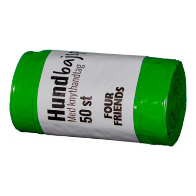 FourFriends hundposer m. håndtag, grøn er fremstillet af kraftig plast i god kvalitet og leveres på en praktisk rulle. Hver rulle indeholder 50 poser, som er nemme at trække ud én ad gangen. Poserne er velegnede til brug på daglige gåture med hunden og kan let lukkes med en knude efter brug.