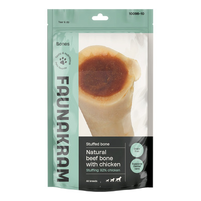 Faunakram Natural Beef Bone med 92 % kyllingefyld er en naturlig tyggebelønning til langvarig aktivering