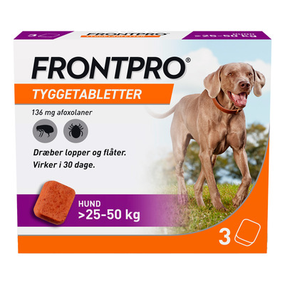 FRONTPRO 136 mg tyggetablet er beregnet til hunde der vejer 25–50 kg. Giv én tablet om måneden for optimal beskyttelse mod lopper og flåter. Tabletten tygges og er velsmagende for de fleste hunde. Nægter hunden at tage tabletten som den er, kan den blandes i foderet.