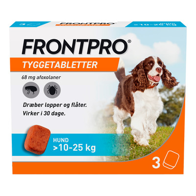 Frontpro® tyggetabletter til hund (11 mg, 28 mg, 68 mg, 136 mg) Indeholder afoxolaner. Til behandling af loppe- og flåtinfestation hos hund.