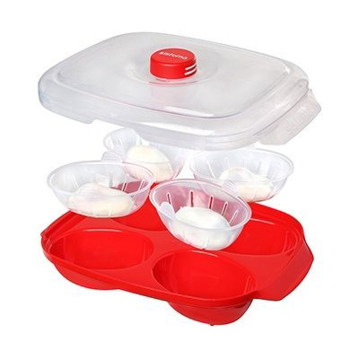 Med kapacitet til fire æg ad gangen er denne bakke en effektiv måde at tilberede pocherede æg på. Du skal blot fylde vand i bakken, slå æggene ud i de fire separate indsatsdele, lægge låg på, og sætte det i mikroovnen. Når æggene er færdigtilberedte, gør de praktiske indsatsdele det let at få æggene ud af bakken og klar til servering.