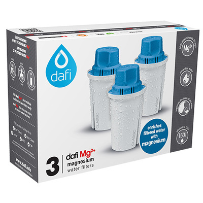 Mg2+ fra Dafi er en smart vandfilterpatron med unik 2i1-effekt: Mens aktivt kul fra kokosnøddeskaller bidrager til at rense drikkevandet for klor og tungmetaller samt der tilføres samtidig mineralet magnesium.