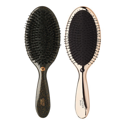 HH Simonsen Wonder & Gloss Brush Gold er skabt til at tage sig godt af både hår og hovedbund. Wonder Brush har Smartflex børstepigge, der beskytter mod spaltede spidser og knækkede hår, og mindsker ubehaget ved filtret hår. Piggenes runde knopspidser masserer hovedbunden og stimulerer blodcirkulationen. Gloss Brush kombinerer fleksible børstepigge med ægte vildsvinehår, der fordeler naturligt hårfedt og giver sundere og glansfuldt hår.
