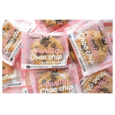 Denne runde Kookie Cat småkage har en dejlig smag af sød vanilje kombineret med stykker af mørk chokolade, der giver en syndig smag. Småkagen er dog baseret på ene gode ingredienser, og er blandt andet lavet med glutenfri havre, cashewnødder og kokos, der giver en rund og afbalanceret smag samt en lækker tekstur. Småkagen er enkeltindpakket og derfor super velegnet at have med på farten.