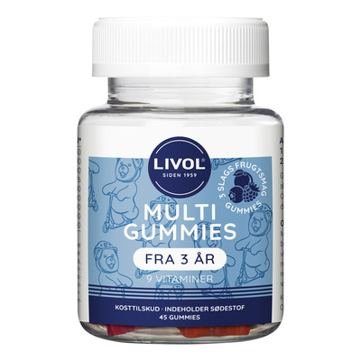 Livol Multivitamin Gummies har en dejlig frugtig smag af appelsin, hindbær og blåbær. Vitaminbjørnene dækker barnets daglige vitamin- og mineralbehov, og er samtidig et sikkert hit hos børnene! Tyggevitaminerne indeholder vitamin A, -C-, -D, -E, -B6 og -B12 samt niacin, folsyre og biotin. Tyggebjørnene sikrer at barnet får sit daglige tilskud af bl.a. D-vitamin, der har betydning for vedligeholdelse af normale knogler og tænder samt C-vitamin, som bidrager til et normalt immunforsvar.