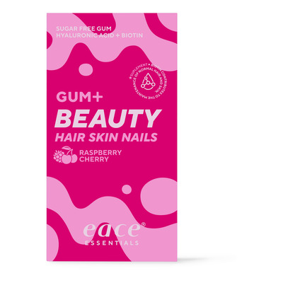 Eace Gum Beauty er tyggegummi med lækker smag af hindbær og et subtilt strejf af kirsebær. Disse tyggegummier indeholder hyaluronsyre, biotin, zink og C-vitamin, der bidrager til normalt hår, normal hud og normale negle. C-vitamin bidrager til normal kollagendannelse, der er vigtig for normal hud. Biotin og zink bidrager til at vedligeholde normal hud, hår og negle. Hyaluronsyre har fugtbevarende egenskaber og kan hjælpe med at opretholde hudens elasticitet.