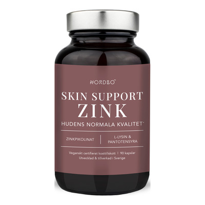 NORDBO Skin Support Zinc er et kosttilskud udviklet med fokus på hudens normale funktion. Det indeholder zinkpikolinat, L-lysin og pantothensyre (vitamin B5). Zink bidrager til at vedligeholde normal hud, hår og negle. Pantothensyre bidrager til en normal omsætning af energi i kroppen. L-lysin er en essentiel aminosyre. Kosttilskuddet kan anvendes dagligt og indeholder aktive ingredienser, som naturligt forekommer i kroppen.