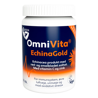 Biosym OmniVita EchinaGold (tidl. EchinaGold) indeholder en særlig kombination af europæisk dyrket rød- og smalbladet solhat samt vitamin C og zink for en bredspektret effekt. Rød solhat (Echinacea purpurea) og smalbladet solhat (Echinacea angustifolia) er en af de mest anvendte og velkendte urter grundet deres virkningsmekanismer i kroppen. De bidrager begge til en normal funktion af de øvre luftveje, hvorfor produktet er en god idé at supplere med i din hverdag eller i perioder med ekstra fokus på dit immunsystem.