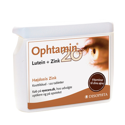 Ophtamin 20 er vitaminer til dine øjne. Produktet indeholder zink og lutein, der bidrager til et normalt syn og en normal omsætning af A-vitamin i øjet. Desuden indeholder produktet C- og E-vitamin, der bidrager til at beskytte cellerne mod oxidativt stress.