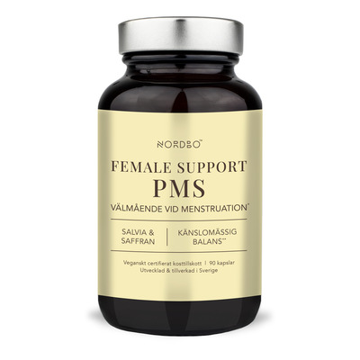 NORDBO Female Support PMS er et vegansk kosttilskud med 10 aktive ingredienser, herunder magnesium, zink, selen, vitamin B6 og det patenterede enzymkompleks Digezyme® (amylase, protease, laktase, lipase og cellulase). Derudover indeholder det ekstrakter fra safran, salvie, rødkløver og ingefær. Magnesium og vitamin B6 bidrager til at mindske træthed og udmattelse, mens zink bidrager til en normal hormonbalance. Selen bidrager til at beskytte cellerne mod oxidativt stress.