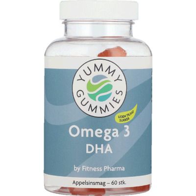 Yummy Gummies by Fitness Pharma Omega 3 DHA indeholder 125 mg DHA (Docosahexaensyre) pr. daglig dosis. DHA er en omega-3 fedtsyre, der bidrager til at vedligeholde en normal hjernefunktion samt et normalt syn ved et dagligt indtag på 250 mg. Dette er et kosttilskud, der supplerer varieret kost. DHA'en i dette kosttilskud kommer fra olie fremstillet af mikroalen Schizochytrium sp. Dette sikrer bl.a. at disse gummies ikke smager af fisk.