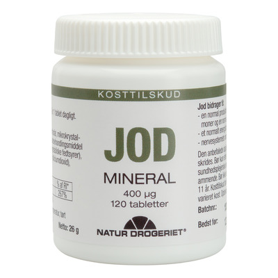 Natur-Drogeriet Jod 400 µg indeholder jod, der bidrager til en normal skjoldbruskkirtelfunktion