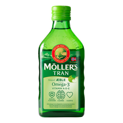Møllers Tran flydende tran med æblesmag hjælper med at supplere din kost i en travl hverdag. Denne originale norske tran har været en del af hverdagen siden 1854, hvor Peter Möller udviklede den første opskrift. Møllers tran produceres af torsk fanget i rene, kolde farvande ud for Norges kyst. Møllers flydende tran er en god kilde til omega-3 fedtsyrer og vitaminerne A, D og E. Den er kendt for sin friske æblesmag, som både børn og voksne elsker.