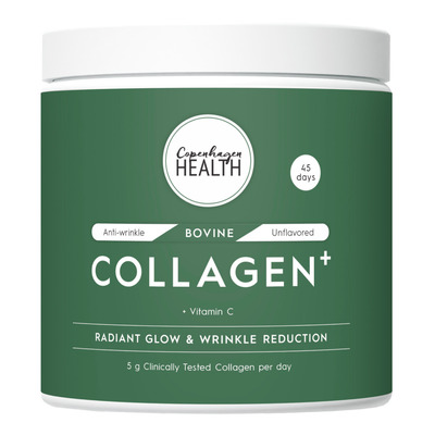 Bovine Collagen+ fra Copenhagen Health er et prisvindende 100% hydrolyseret bovine-kollagenpulver, som dokumenteret reducerer rynker og fine linjer og fugter og plejer huden indefra. Den daglige dosis er på hele 5000 mg kollagen og 160 mg vitamin-C (200% af RI).
