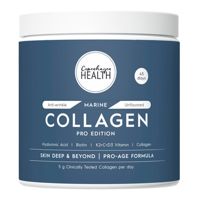 Copenhagen Health Marine Collagen Pro Edition indeholder klinisk og dermatologisk testet kollagenpulver med dokumenteret effekt på reducering af rynker og fine linjer. Det 100% hydrolyserede marine-kollagenpulver er tilsat hyaluronsyre, en kombination, der bidrager til at opretholde hudens fugtniveau, tekstur og fasthed. Du får desuden støtte til knogler, muskler, hår og immunforsvar* med tilsætningen af vitaminerne C, D3, K2 og Biotin.
