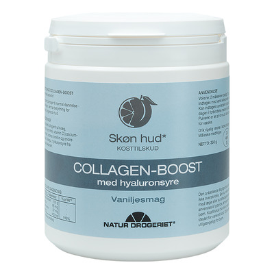 Natur-Drogeriget Collagen Boost med vaniljesmag er et lækkert kollagentilskud med hydrolyseret kollagen fra kvæg, C-vitamin, hyaluronsyre og kiselpulver. Det er specifikt lavet til at hjælpe din hud til at blive spændstig, ungdommelig og elastisk. Kollagen er nemlig den mest almindeligt forekommende proteintype i kroppen og er også den primære bestanddel i kroppens bindevæv. Det har dermed stor betydning for hudens udseende og funktionalitet.