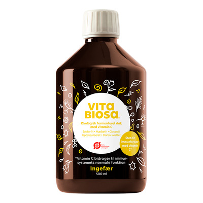 Vita Biosa Ingefær indeholder de samme urter og mælkesyrebakterier som den orignale Vita Biosa, men er derudover tilsat 0,8% koldpresset ingefærjuice samt acerolabærpulver med indhold af vitamin C. Indholdet af vitamin C bidrager til et normalt energistofskifte, beskyttelse af cellerne mod oxidativ stress og immunsystemets normale funktion, samt bidrager til at mindske udmattelse og træthed.