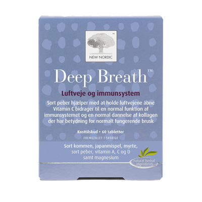 Deep Breath fra New Nordic indeholder sort peber, som hjælper til med at holde dine luftveje åbne. Derudover indeholder Deep Breath også vitamin C, der bidrager til normal dannelse af kollagen, som har betydning for normalt fungerende brusk. Derudover bidrager vitamin A, B12, C og D til den normale funktion af immunsystemet.