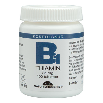 Kosttilskud fra Natur-Drogeriet indeholdende 100 tabletter fyldt med vitamin-B1. B1 vitaminet findes i fødevarer som svinekød, gær, kål, kartofler og appelsiner, men hvis du ikke får nok gennem din daglige kost, kan du med fordel tage et supplerende tilskud. B-vitaminer udskilles generelt relativt hurtigt fra kroppen, og derfor har du ofte brug for en tilføring. Én af disse tabletter supplerer dig med 25 mg af det gavnlige vitamin.