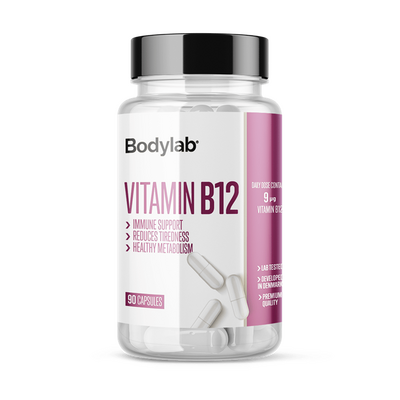 Vitamin B12 er et vitamin, også kendt under navnet cobolamin, der ikke kan dannes naturligt i kroppen. Derfor skal vitamin B12 tilføres gennem kosten, hvor det blandt andet findes i animalske fødevarer som æg, fjerkræ, fisk, kød og mejeriprodukter. Hvis du ikke får nok vitamin B12 gennem kosten (evt. fordi du er veganer) kan du supplere en varieret kost med et kosttilskud. Bodylab Vitamin B12 er et laktosefrit, glutenfrit kosttilskud med 9 μg B12 pr. kapsel, der er nemt at synke sammen med et glas vand.